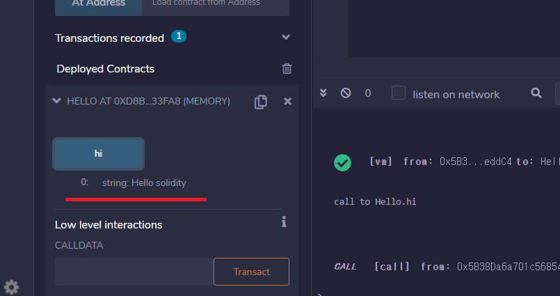 hi 버튼을 클릭을하면 hello solidity가 출력이 되는걸 알 수 있습니다.