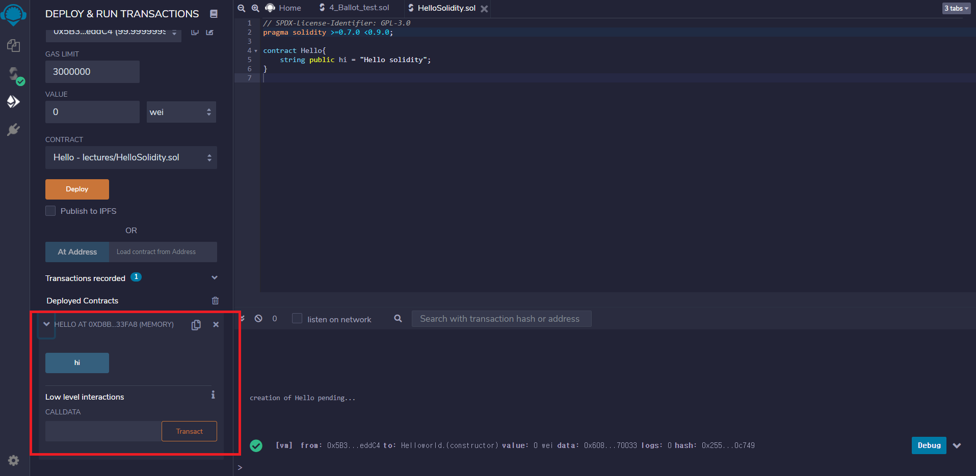 string public hi = "Hello solidity"; : hi 라는 public 함수에 hello solidity 를 넣었습니다.