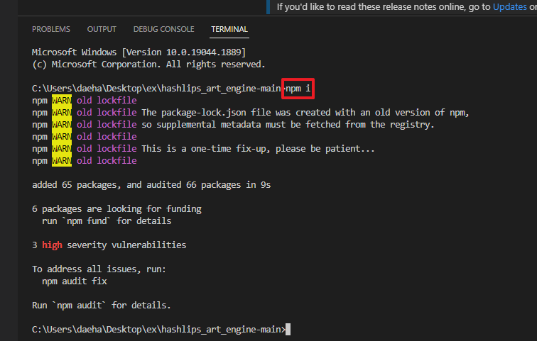 4. 다음 그림과 같이 터미널창에 npm i 를 입력합니다.