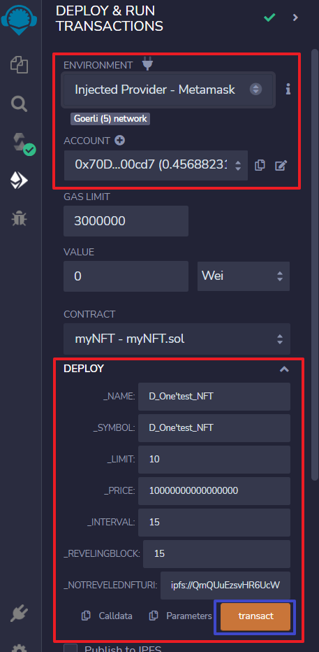 자 이와 같이 다 되었다면, transact 버튼을 눌러서 배포를 합니다.